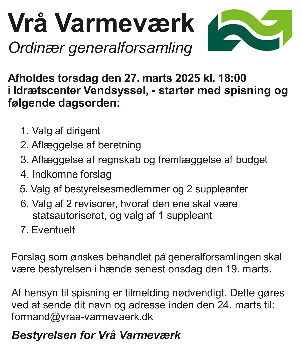 Indkaldelse til generalforsamling 2025. Der startes med spisning og herefter generalforsamling. Husk at tilmelde dig ved at sende mail, så vi kan bestille mad til alle fremmødte.