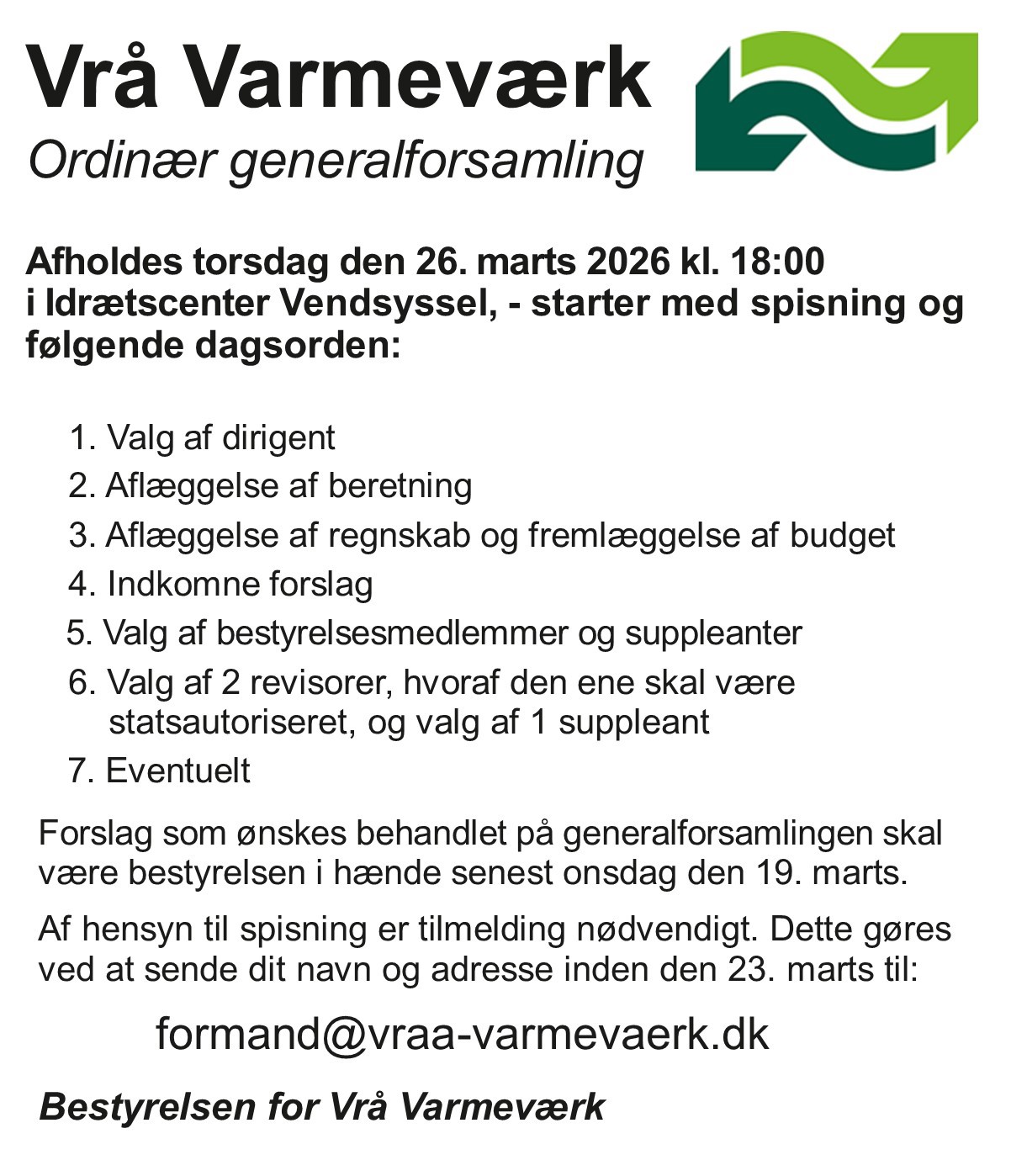 Indkaldelse til generalforsamling 2026. Der startes med spisning og herefter generalforsamling. Husk at tilmelde dig ved at sende mail, så vi kan bestille mad til alle fremmødte.