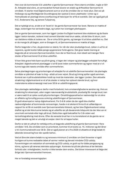 Hen over de kommende 5 år udskifter vi gamle fjernvarmerør i flere større områder, nogle er 50+ år. Arbejdet skal sikre, at varmeværket fortsat leverer en stabil og driftssikker fjernvarme til området. Vi starter med Digterkvarteret som er et af de områder der er mest akut.